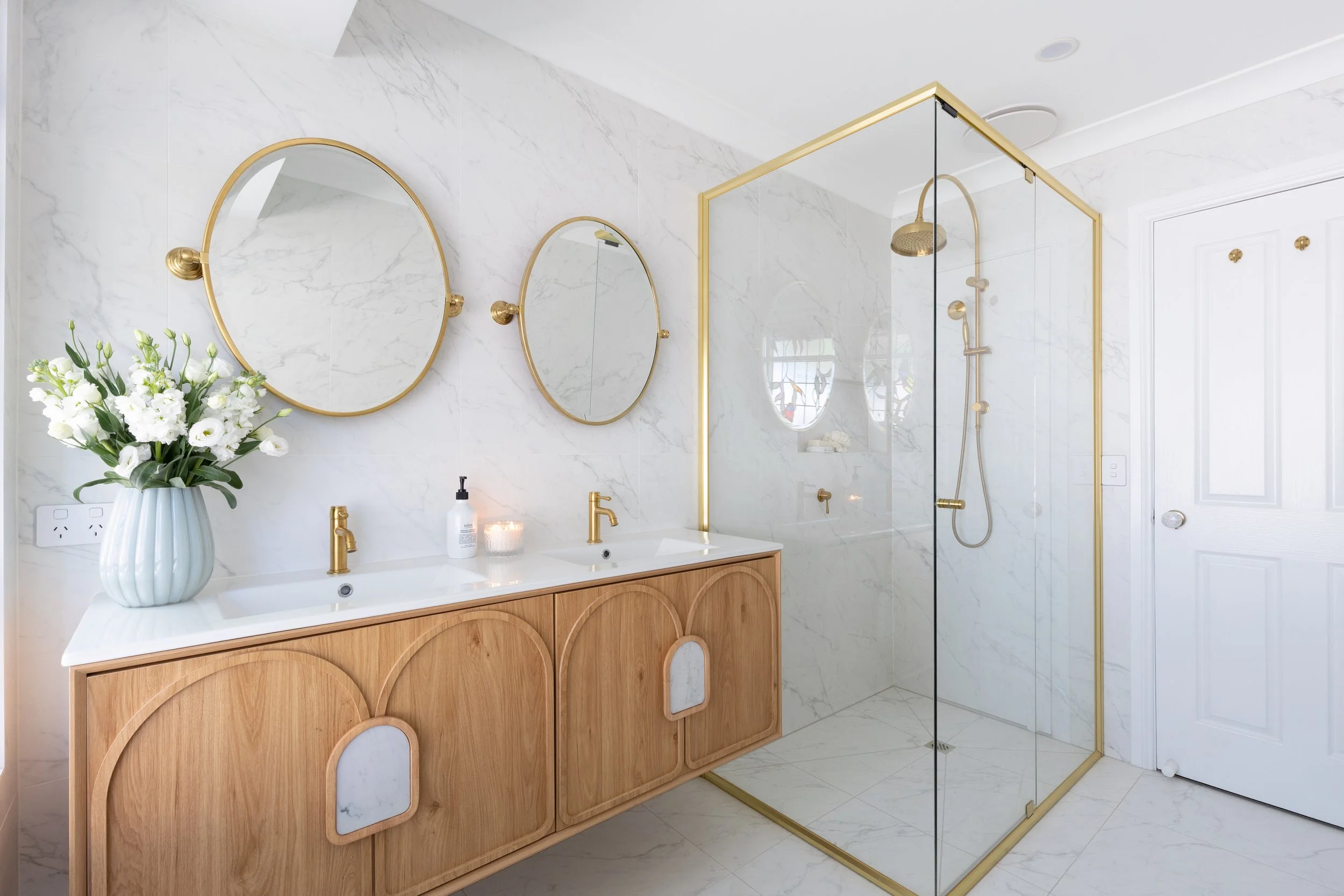 We continued the Carrara marble tiles across both the floor and walls, giving the room a seamless and luxurious flow. Gold tapware and a swivel mirror in a heritage style add warmth and elegance, while large-format tiles and an all-in-one moulded basin keeps cleaning effortless.